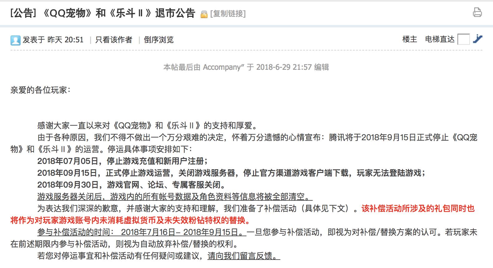 这款上线于2005年的虚拟宠物社区游戏,要与玩家告别了。6月29日晚,腾讯官方发布公告称,将于9月15日正式停止《QQ宠物》和《乐斗Ⅱ》的运营,并对玩家进行相应补偿。