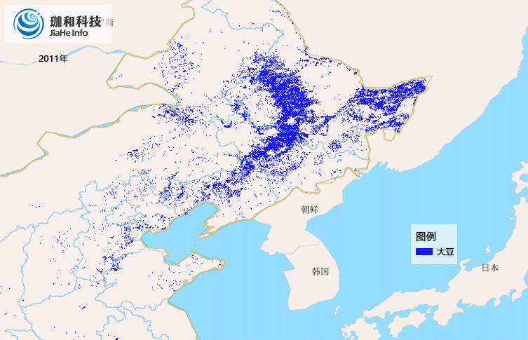 中国大豆的分布图,从出苗起每 2 个月更新一次