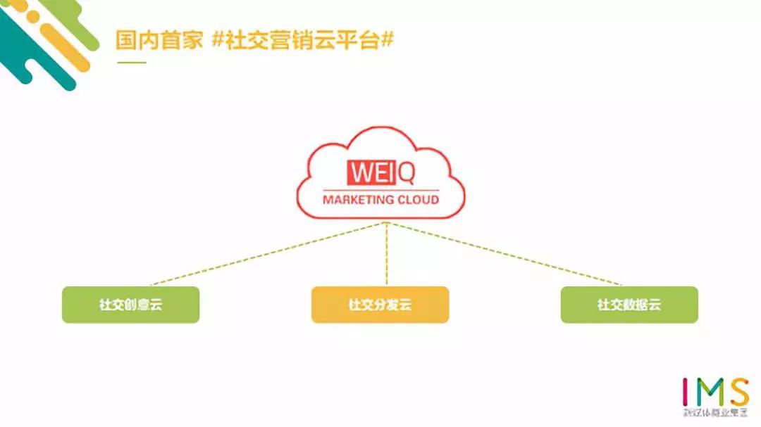 通过社交分发云,广告主在 WEIQ 平台上可获得特定的营销方案,通过 IMS 在新媒体领域专属的云计算技术分发账号,按效果结算的营销产品服务,支持企业按照曝光/阅读量、粉丝关注、应用下载等维度进行付费。