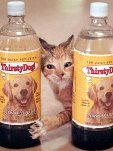 宠物在喝水的时候会很挑剔。至少这是为宠物准备的瓶装水的创造者的想法。该公司在瓶装水中注入维生素和香料——脆皮牛肉(狗用)和咸鱼(猫用)。没有足够的人愿意把钱花在宠物瓶装水上,而其他人则认为这是一个笑话。