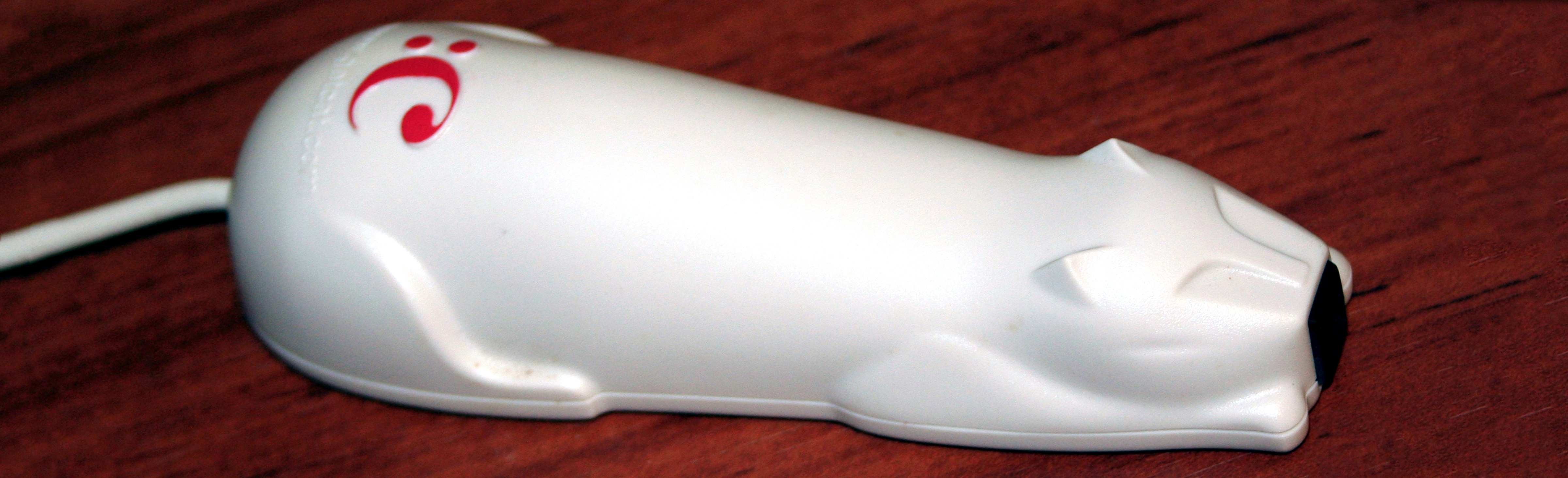 回到人们还在读印刷杂志时,这款想法是,你会用这个形状奇特的设备扫描杂志中的条形码,然后用USB电缆把它插入你的电脑,然后Cue Cat会把你的浏览器指向一个从该设备导出的URL。