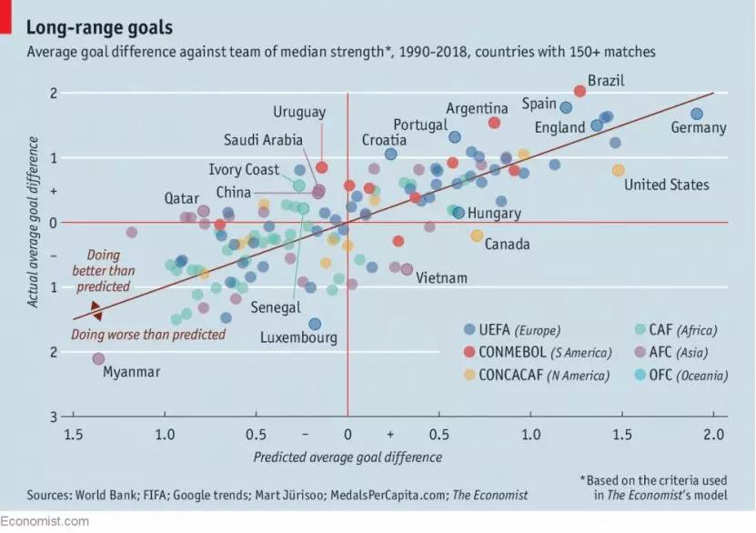 每经小编(微信号:nbdnews)注意到,在本届杯赛开幕前夕,经济学人杂志使用计量模型分析发现: