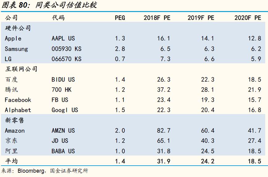 首先,从成长性来说。下图中列举了全球在科技硬件、互联网和新零售方面的龙头企业作为PEG估值的参考。剔除PEG偏高的三星和亚马逊之外,得出全球可比公司平均PEG为1.15。