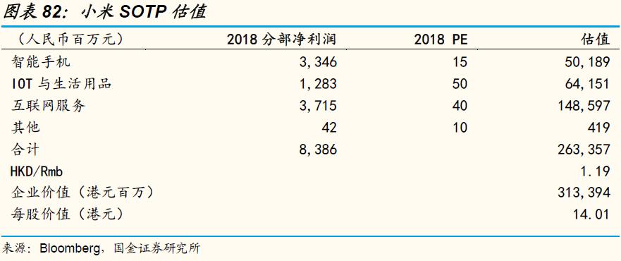互联网服务方面,参考港股和A股相关企业的估值水平,给出40倍的预测PE。其他业务给与10倍预测PE。在这个框架下,小米的企业价值为3133亿港元,相当于每股14.01港元。