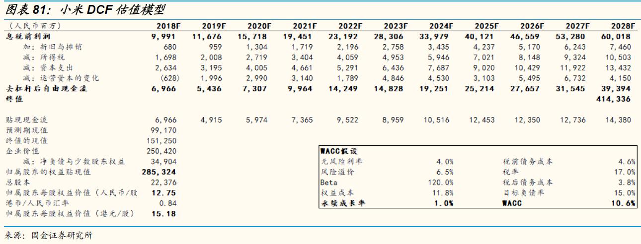 从现金流角度来看,在10.6%的WACC和1%的永续增长率假设下,得出小米的企业价值为3397亿港元或每股15.18港元的合理价值。