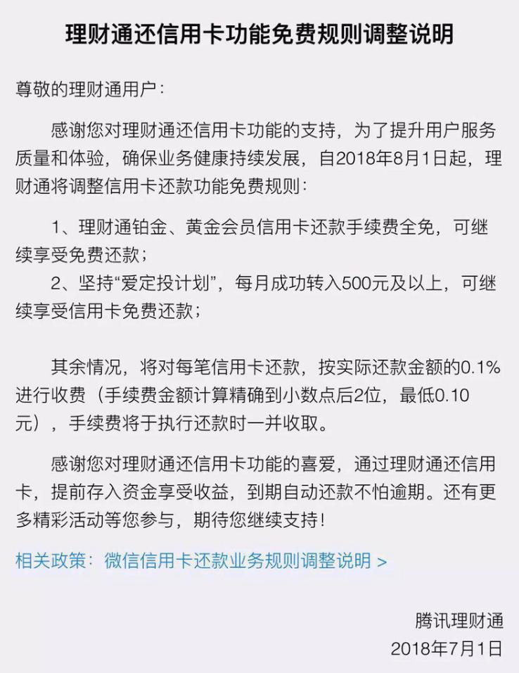 8月1日起,腾讯理财通、微信信用卡还款将收0.1%手续费