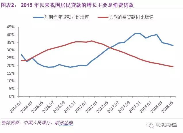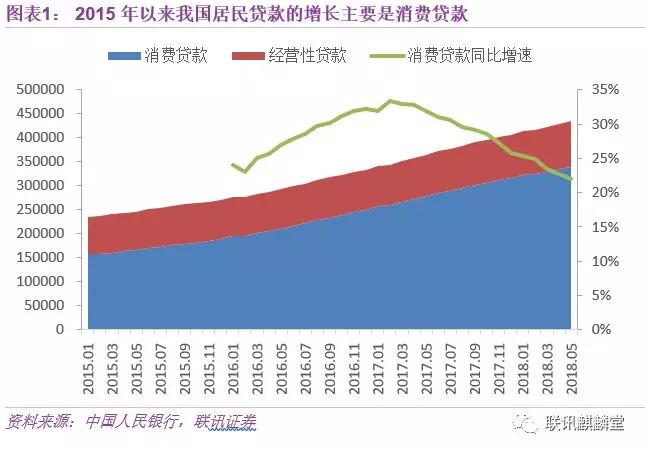 近年来,我国消费信贷增速较快,根据金融机构信贷收支表的统计 ,如图【1】所示,2015年以来我国居民贷款的增长主要就是消费贷款(短期贷款中的消费贷款+长期贷款中的消费贷款),从2015年1月的15.7万亿增加到2018年5月的33.9万亿,增长了116%,月同比增速28%。