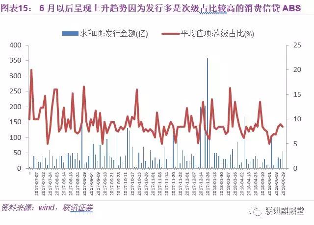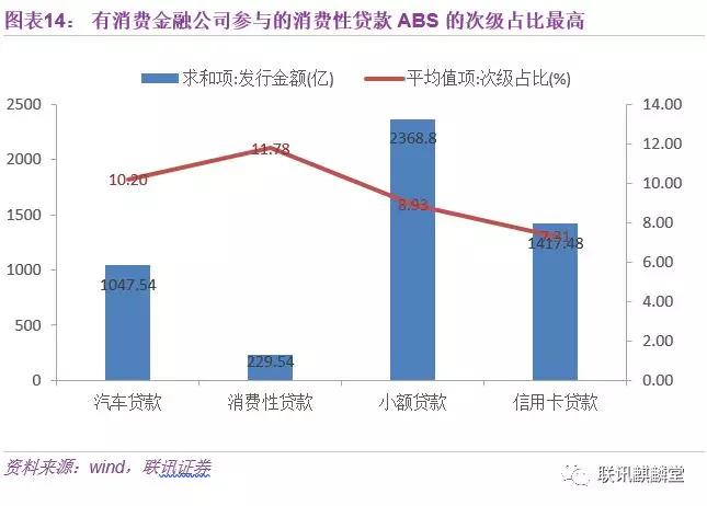 发现次级占比的趋势上来看,我国消费金融ABS的平均次级占比是在稳步下降的,今年6月以后呈现上升趋势主要是因为发行的都是次级占比较高的消费信贷ABS。