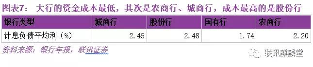 从基本情况上来看国有行的资金成本是1.74%,是所有银行中最低的,其次是农商行2.2%,农商行2.45%,成本最高的是股份行2.48%。