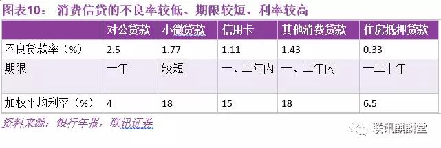 然而消费金融(包括信用卡贷款)虽然不良率不低,但是同样利率也相对较高,根据当前市场的基本情况,利率平均大概在20%左右(以日息万五计算,年利率是18.25%)。资产的不良率越高,信用风险溢价也就越高,利率就越高。