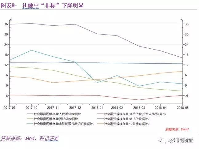 资管新规意见稿公布以后,2017年9月开始社融规模同比增速呈现显著下降的趋势,今年5月从10.51%下降到10.27%,下降了24个百分点,其中除了外币贷款和企业债券出现小幅上升,人民币贷款保持基本平稳,略有下降,非标显著下降,这表明部分银行“非标”无法回表就萎缩了。