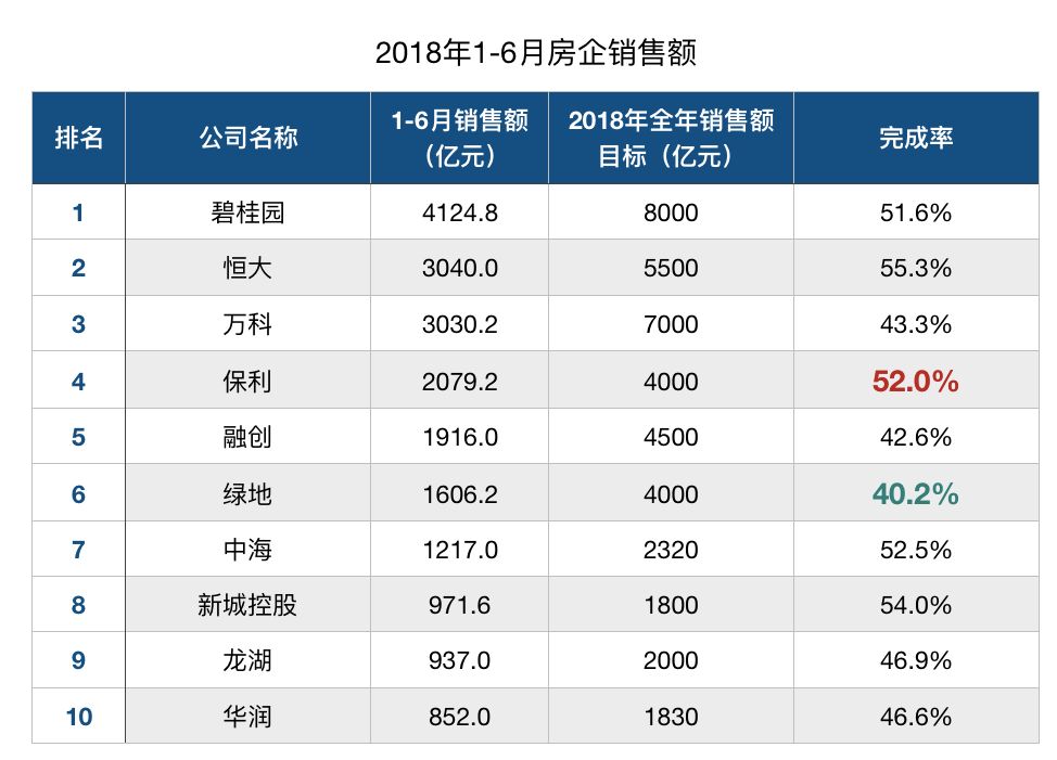 通过 2018 年 1-6 月销售额和 2017 年全年销售额对比来看,保利今年的进步比较突出,实现销售额 2079.2 亿元,完成全年销售目标的 52%,且超过融创稳居第四。