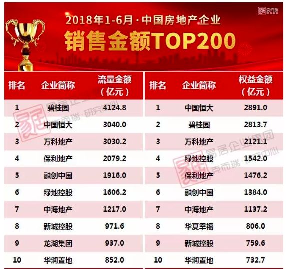地产成绩单(2018上):碧桂园半年超4000亿,恒大权益金额第一