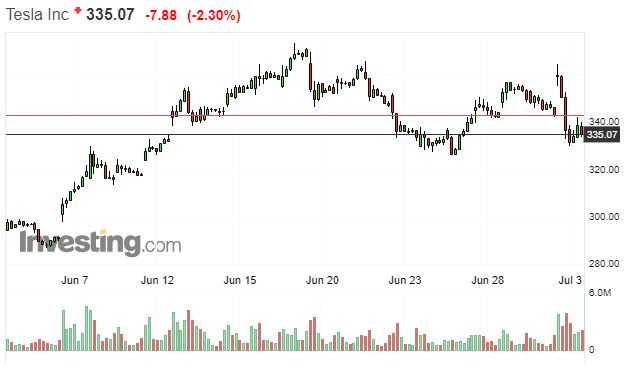 特斯拉周一收跌2.3%,报收于335.07美元,创6月22日以来最低。