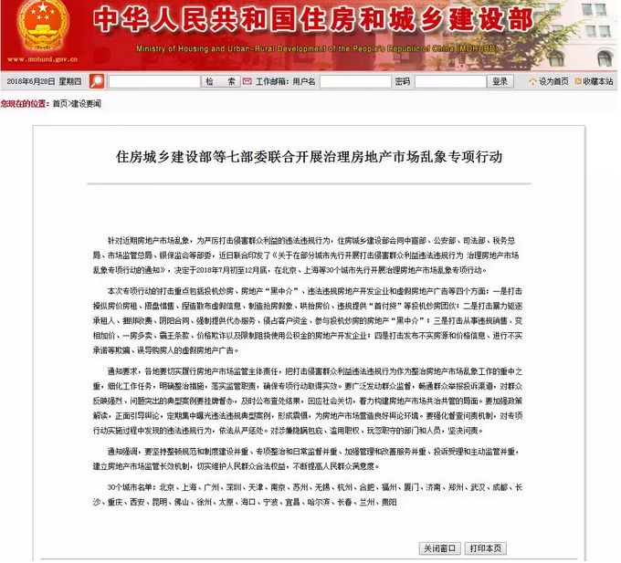 6月28日,住建部、公安部等七部门联合印发了《关于在部分城市先行开展打击侵害群众利益违法违规行为 治理房地产市场乱象专项行动的通知》,决定于2018年7月初至12月底,在北京、上海等30个城市先行开展治理房地产市场乱象专项行动。