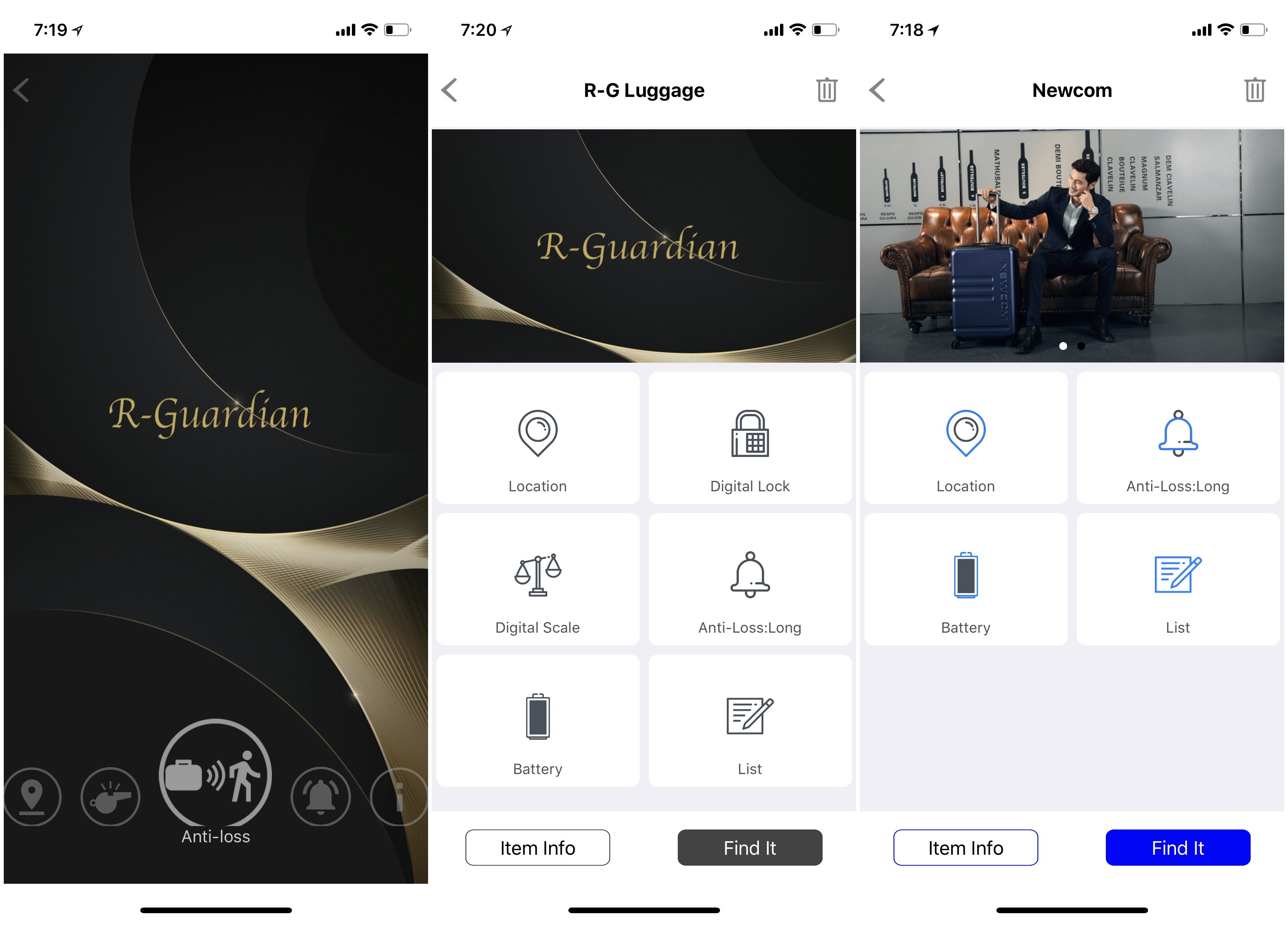 智能行李箱是 R-Guardian 的主打产品,主要为各大箱包品牌提供技术输出,包含5个主要功能:全球定位、智能称重、生物信息解锁、行李到达提醒以及防丢预警。