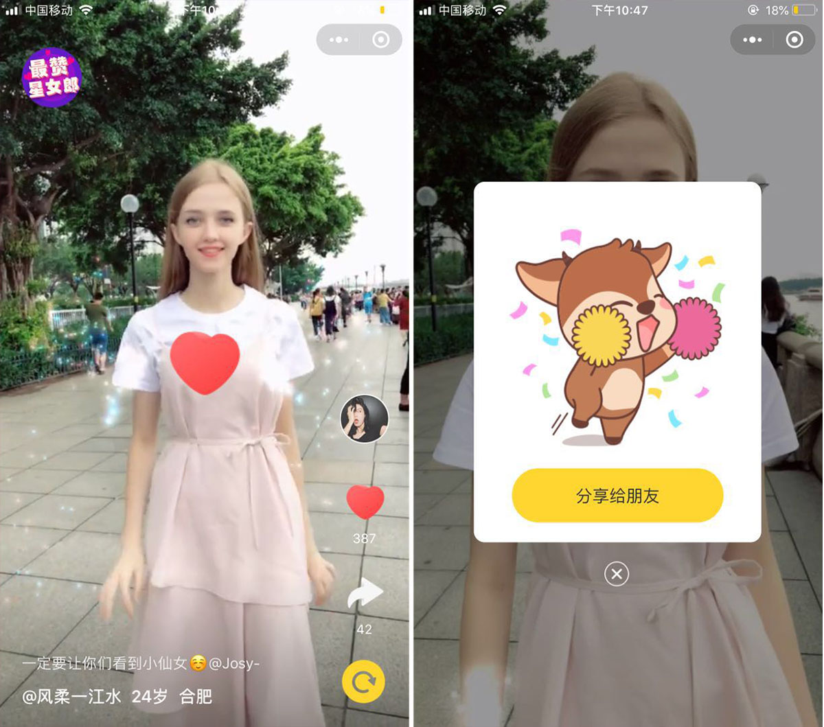 投票方式非常简单,点击视频右侧的「💗」就可以点赞,点击「向右箭头」就可以转发给朋友了。