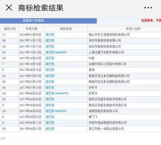 ▲“姆巴佩”也被注册成商标