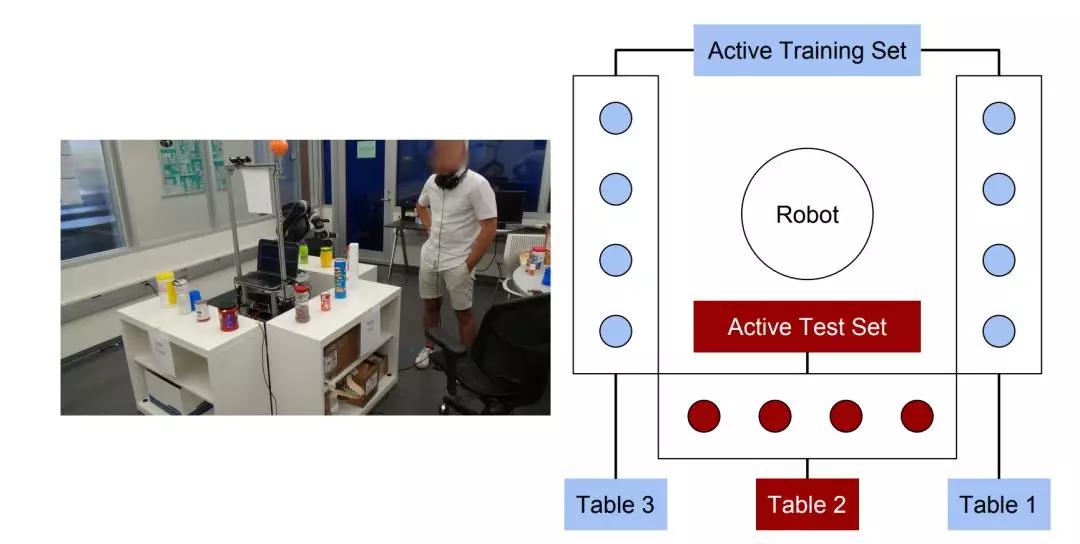 图3. 在Thomason, Padmakumar, Sinapov et al., CoRL 2017中,实验者首先用自然语言向机器人描述桌2(测试集)上某一物体,然后机器人针对桌1和桌3(训练集)上的物体进行发问,实验者回答。最后机器人猜测实验者描述的是桌2上的哪个物体。