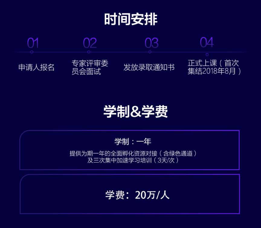 “AI赛道明星班”首期班单人学费仅20万元,学制一年,学员将享受为期一年的全面孵化资源对接(含绿色通道:投资、阿里生态体系、阿里&36氪各类年度大型活动、媒体曝光等资源的优先参与权),以及三次集中加速学习培训(3天/次)。