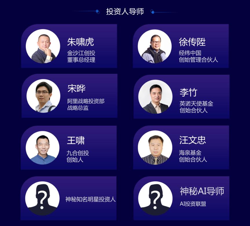 尤其是配备了强大的导师团队,比如金沙江创投朱啸虎、经纬中国徐传陞、九合创投王啸、达摩院机器智能技术实验室语音交互智能首席专家鄢志杰、阿里云副总裁刘松、出门问问CEO李志飞等,届时还有神秘知名明星投资人到场,保证任何方面的疑问都有高手作答。