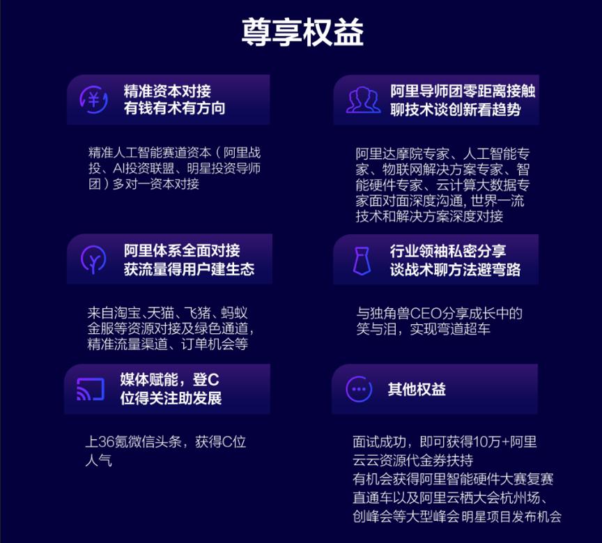 这里有阿里AI投资联盟、知名投资机构、阿里研究院、阿里云、太极禅苑、达摩院,帮助创业者对接资本,解读技术趋势;有淘宝、天猫、飞猪、蚂蚁金服、钉钉等庞大的流量资源供创业者优先享受;还有独角兽CEO前来分享经验教训;顺利入选“AI赛道明星班”的创业团队还将有机会获得36氪微信头条的独家宣传报道。
