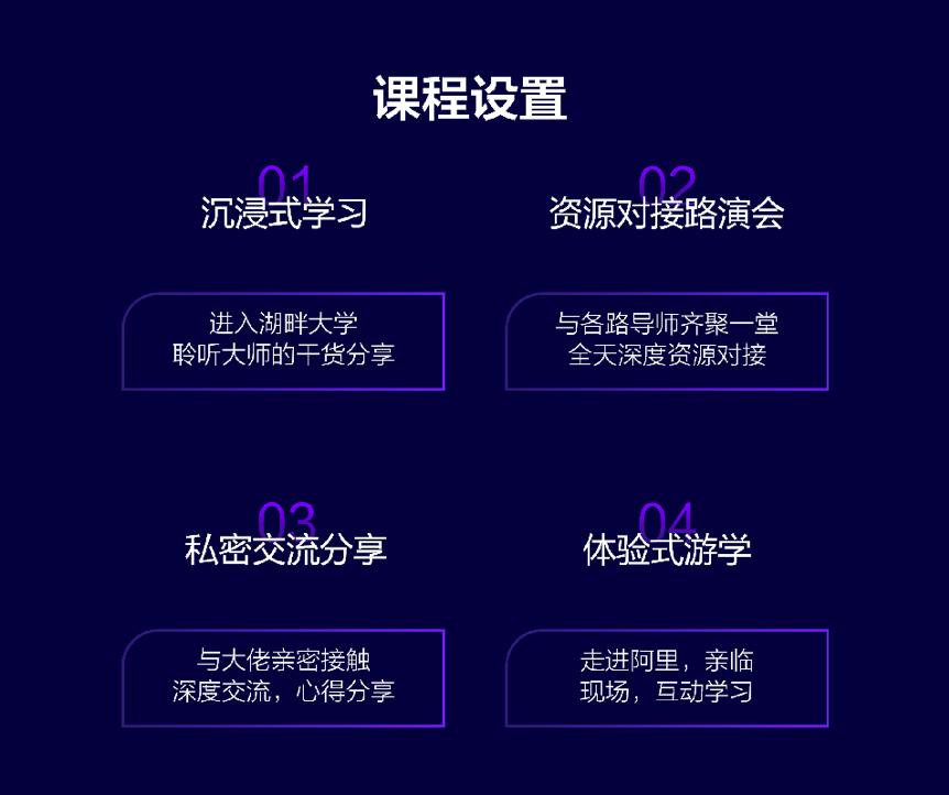 课程设置为四大形式,包括沉浸式学习、资源对接路演会、私密交流分享和体验式游学。