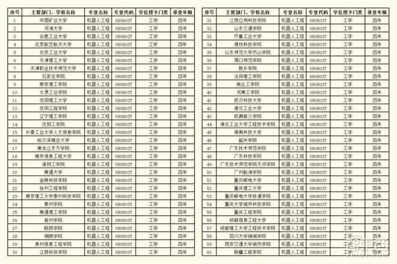 今年3月21日国家教育部公布了“2017年度普通高等学校本科专业备案和审批结果的通知”,确定了审批同意设置的国家控制布点专业和尚未列入目录的新专业名单,其中超过100家高校,将机器人工程作为新增专业。