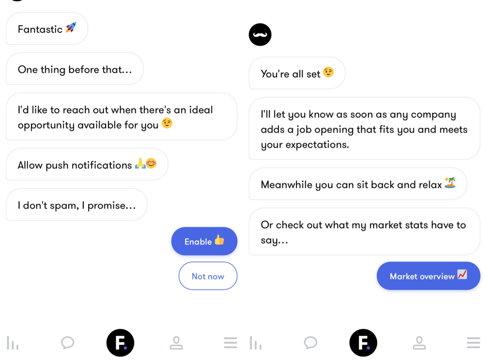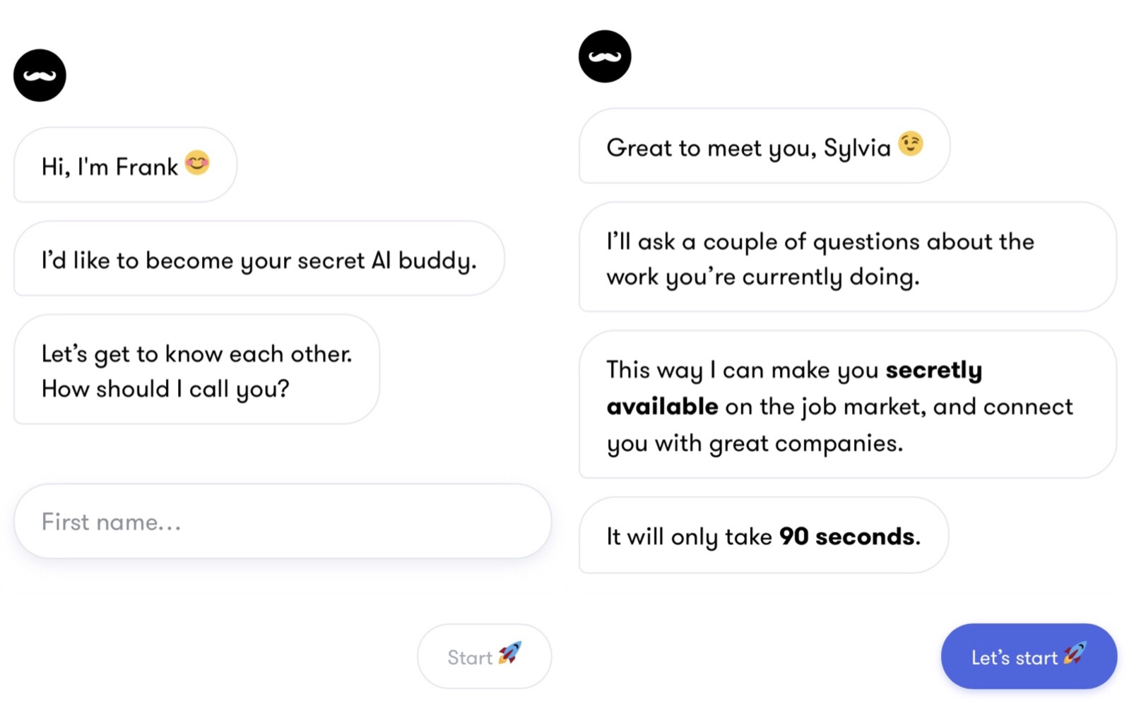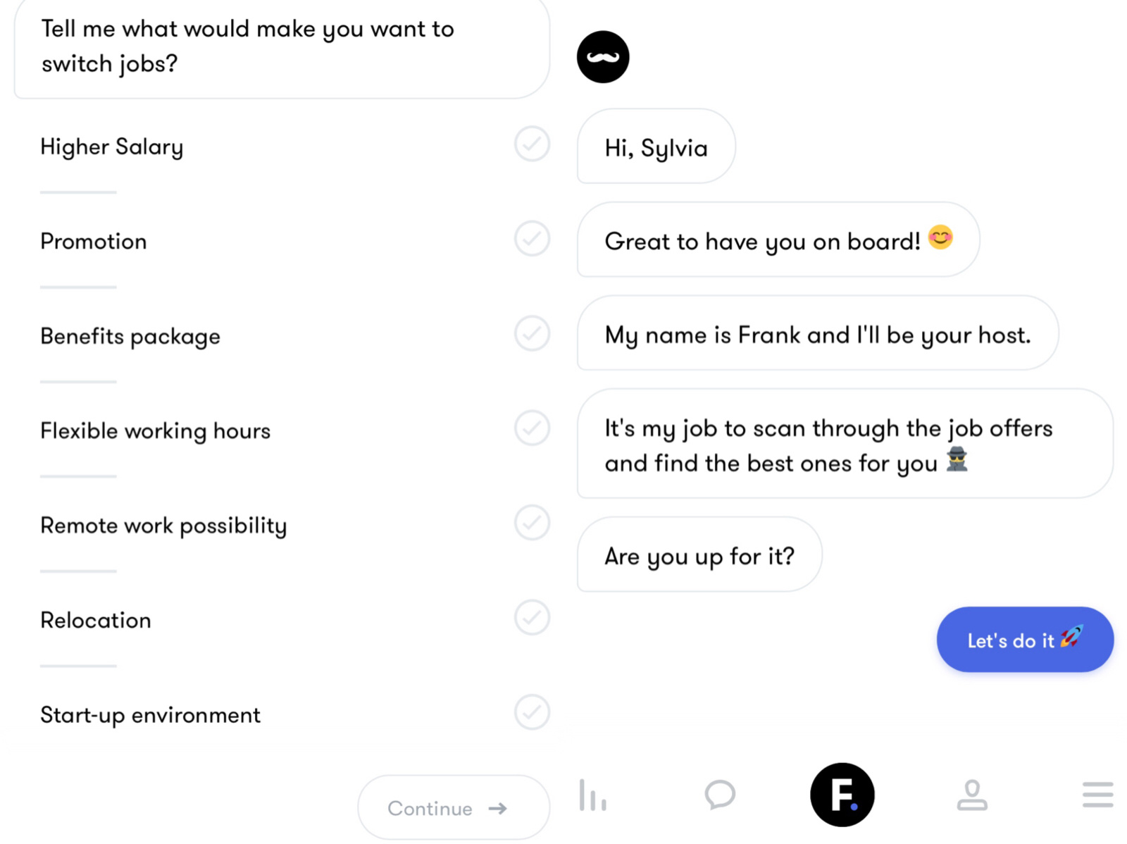 没错,MeetFrank 的主角就是一个叫Frank的聊天机器人。下载该app的用户首先要和Frank进行一次快速的“入职谈话”—— 从设定好的各种选项中选择他们拥有的技能、经验、为何要换工作、目前职位、薪水等等,省去自己写简历、填表格的烦恼。并且,用户不需要提供任何可以识别个人身份的信息,仅通过自身能力去匹配潜在的工作机会。