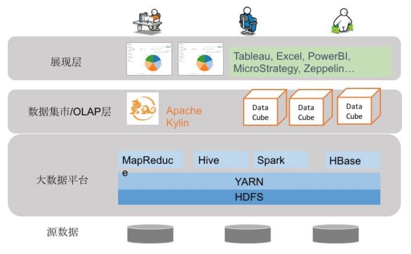 如下图所示,Kyligence是在大数据平台和展现层之间的数据集市/OLAP层。底层数据源来自Hive、SparkSQL、Kafka等,上层展现层则是像Tableau这类BI产品。现如今,Kyligence在底层还支持了传统的数据仓,像Greenplum、Teradata等,以及创业公司产品,像偶数等。