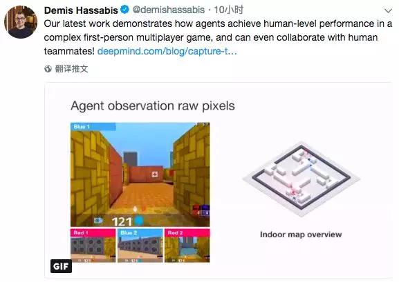 CEO Hassabis在Twitter上分享:“我们最新的工作展示了智能体在复杂的第一人称多人游戏中达到人类水平,还能与人类玩家合作!”
