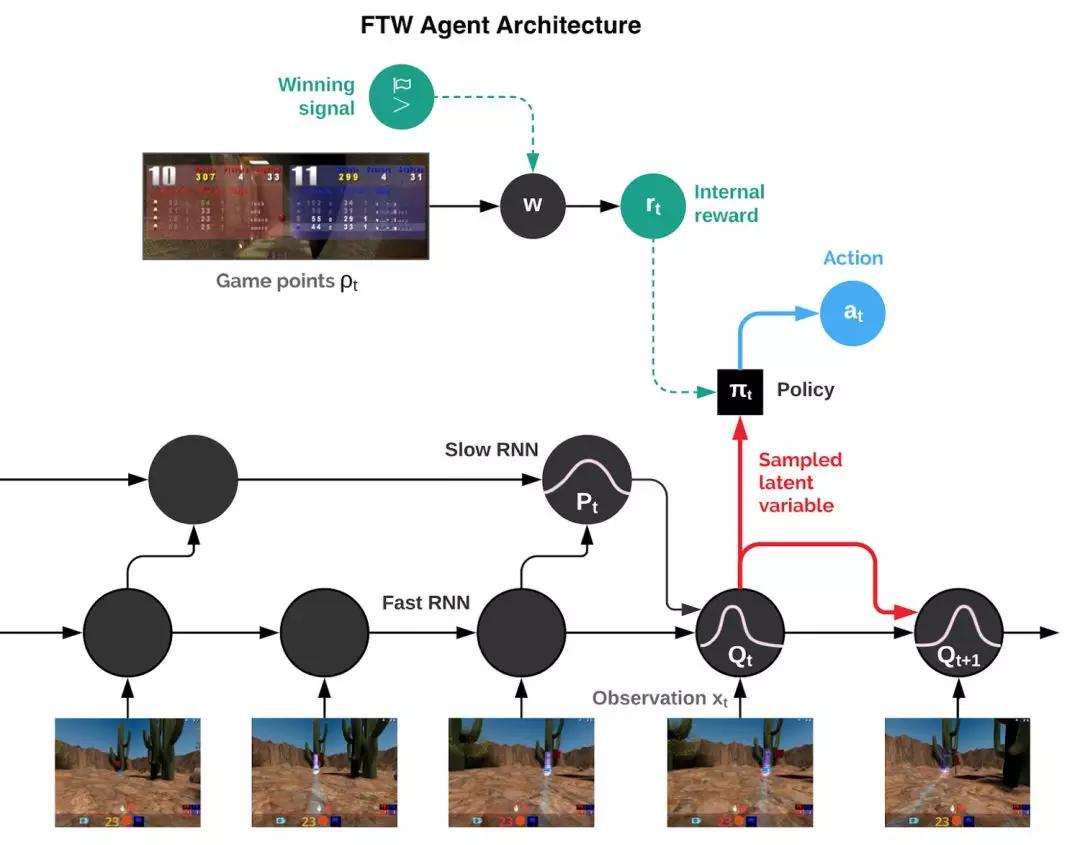 图: For The Win (FTW)智能体架构的示意图。该智能体将快速和慢速两个时间尺度的循环神经网络(RNN)相结合,包括一个共享记忆模块,并学习从游戏点到内部奖励的转换。