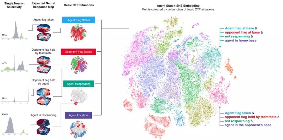 为了理解智能体如何表示游戏状态,我们研究了在平面上绘制的智能体的神经网络的激活模式。下图中的点表示游戏过程中的情况,近处的点表示类似的激活模式。这些点是根据高级CTF游戏状态进行着色的,在这些状态中智能体要问自己:智能体在哪个房间?旗子的状态是怎样的?可以看到哪些队友和敌手?我们观察到相同颜色的集群,表明智能体以类似的方式表示类似的高级游戏状态。