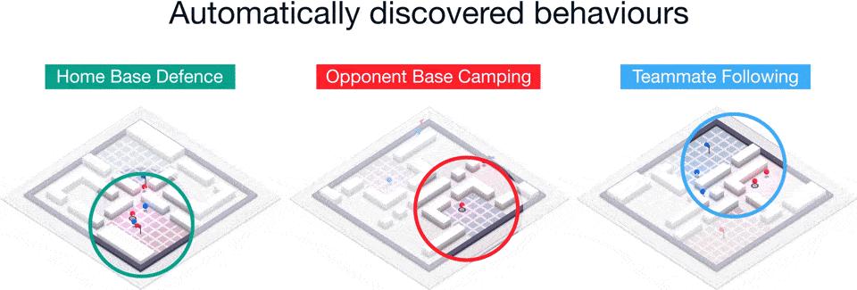 在训练过程中,AI发展出了自己的奖励机制,学会了基地防守、尾随队友,或者守在敌人营地外偷袭等策略。