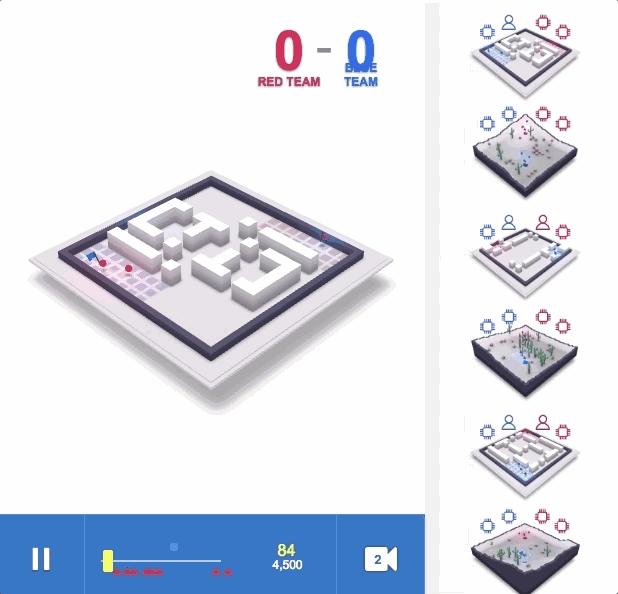 研究人员对AI的唯一限定是,在5分钟时间里尽可能取得多的旗帜。对战的游戏地图是随机生成的,每场都会变,室内与室外的地形也不相同。组队的时候,AI可能与人组队,也可能与其他AI组队。对战的模式分为慢速和高速两种。