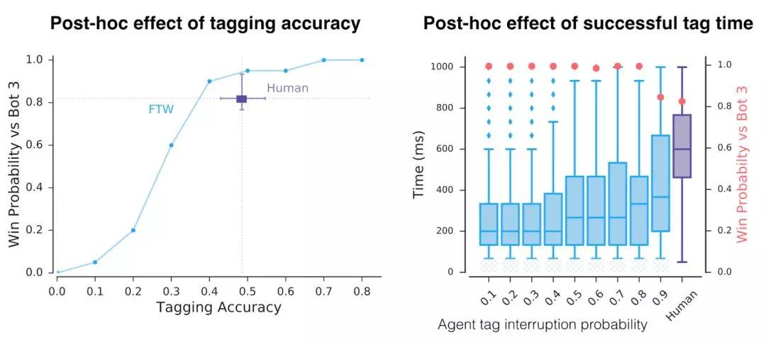 训练后人为地降低了智能体的tagging精度和tagging反应时间。即使在具有于人类相当的准确度和反应时间下,智能体的性能仍高于人类。