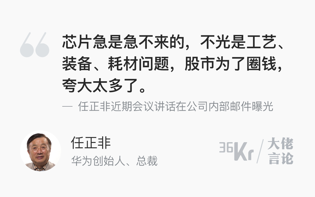 邮件中,任正非谈到了中国的芯片问题,他表示,“芯片急是急不来的,不光是工艺、装备、耗材问题,股市为了圈钱,夸大太多了。”