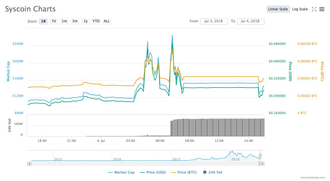 据Coinmarketcap数据,Syscoin(简称SYS,系统币)价格在过去24小时内一度飙升了近90%。