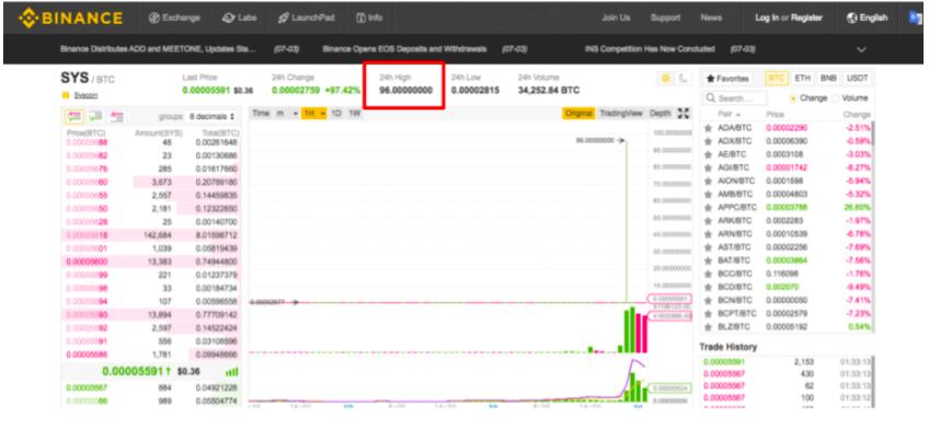 SYS曾在周二晚上9点左右在Twitter上表示,他们注意到系统存在潜在问题,建议各交易平台在SYS调查期间暂停SYS相关交易。随后,币安交易所就发生了一笔这样的交易:一枚SYS卖出了96个比特币的价格,也就是约60万美元。这笔交易引发了SYS后续价格的高涨。