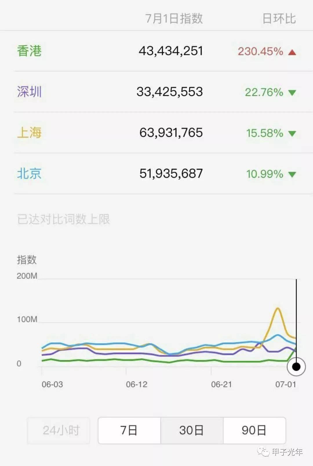 在微信指数中,香港的热度不及北京、上海、深圳