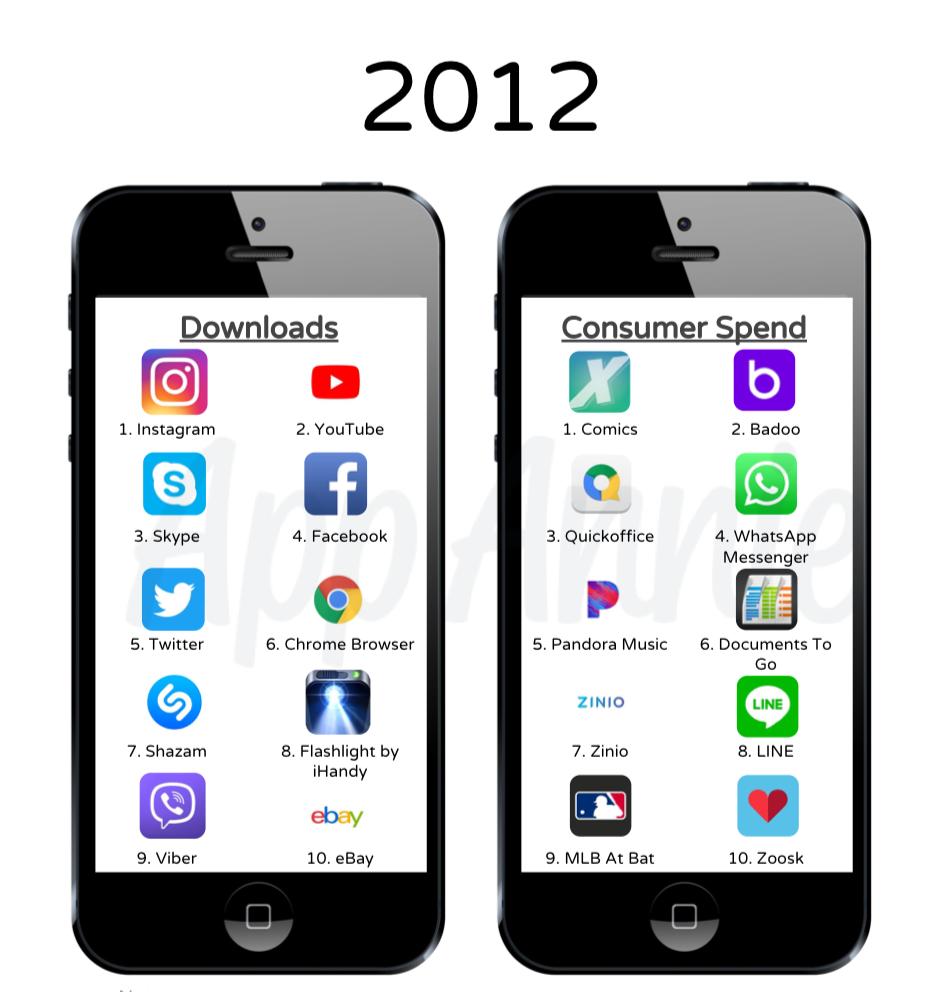 时间来到 2012 年。随着 iOS 6 的发布,Youtube 和 Google Maps 不再是 iOS 内置的原生应用。尽管如此,随着 WIFI 的普及,在手机上看视频这件事变得越来越重要,巨大的用户需求让 Youtube 在当年迅速占据了用户下载量第二的位置。