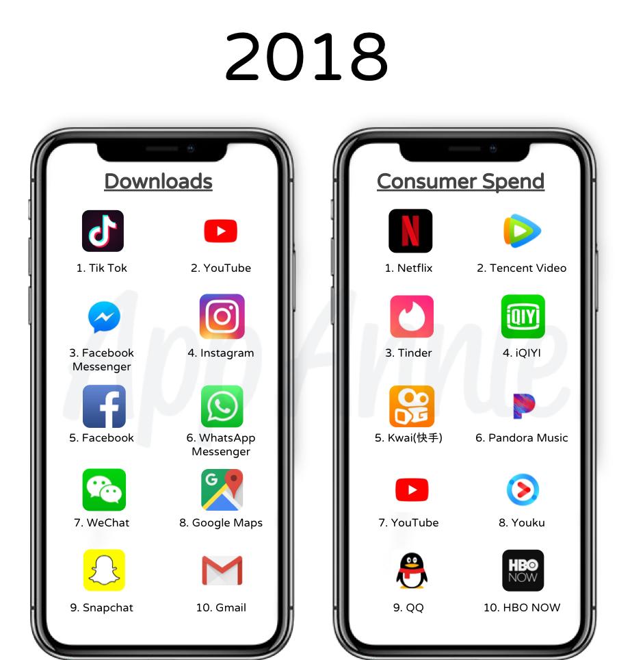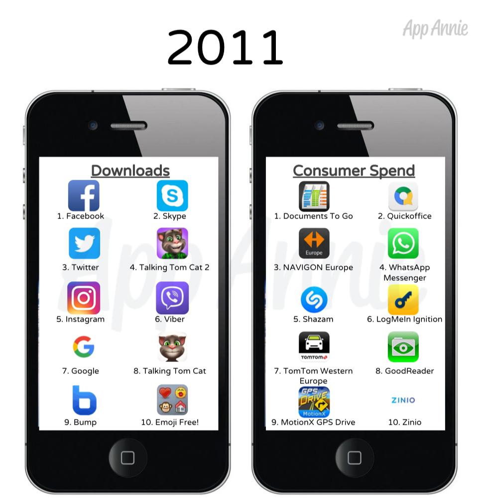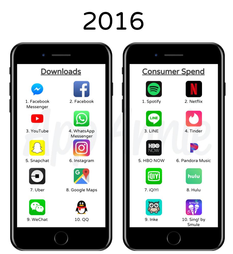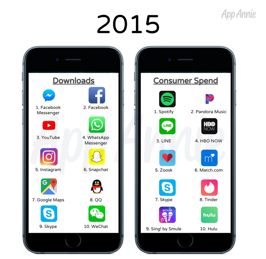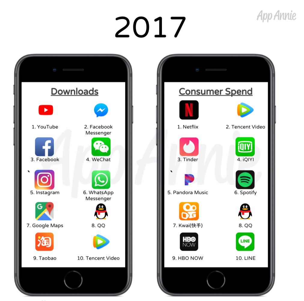 App 方面,Facebook 无疑是当年最受用户欢迎的社交平台。在 Facebook Messenger 成为独立应用后,它和 Facebook 一起占据了当年全球下载量第一和第二的位置,直到 2017 年才被 Youtube 重新超过。