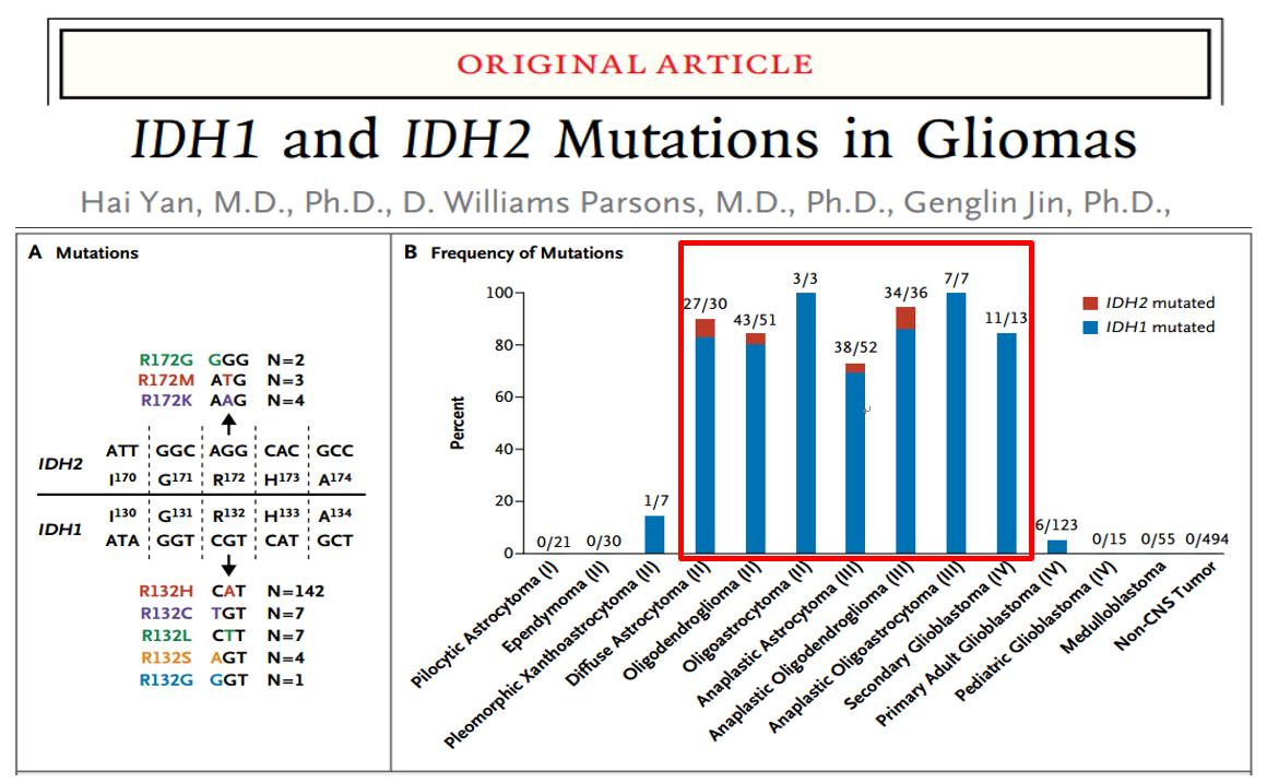 2008-2009年,杜克大学讲席教授、泛生子首席科学家兼联合创始人阎海教授在脑肿瘤基因组学的研究过程中率先发现该基因热点突变与恶性肿瘤的关联:首次在IV级胶质母细胞瘤中发现IDH1的热点突变,并进一步明确了IDH1/2基因热点突变在不同类型胶质瘤中的分布情况及其临床意义,成果分别刊登于《科学》和《新英格兰医学杂志》,对于胶质瘤诊断和手术方案具有颠覆意义。后续多个研究团队陆续在多种恶性肿瘤,如急性髓系白血病(AML)、胆管癌、胸腺肿瘤中发现IDH1/2基因的热点突变。