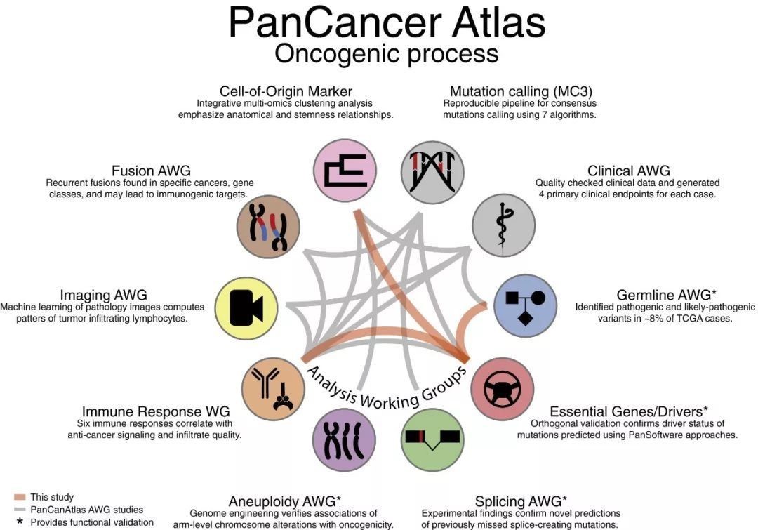 来自16个国家的数百位顶尖学者,针对覆盖33种最常见癌症的11000多个肿瘤样本进行基因测序,并将癌症基因组学、蛋白组学、表观遗传、临床数据等进行综合分析,挖掘出其中的有效信息,发现逾300种癌症致病基因,并根据分子特征对人类癌症类型进行了重新分类,成功绘制出泛癌症图谱(Pan-Cancer Altas)。该图谱对癌症如何产生、在何处产生、为何产生进行了深入的剖析,是人类癌症研究的“谷歌地图”。