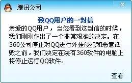 奇虎360与腾讯掐架,最后腾讯冲冠一怒:在装有360软件的电脑上停止运行QQ软件,只有卸载360软件才可登陆QQ,公开逼迫用户二选一。