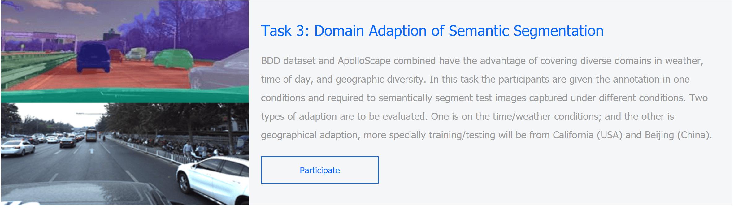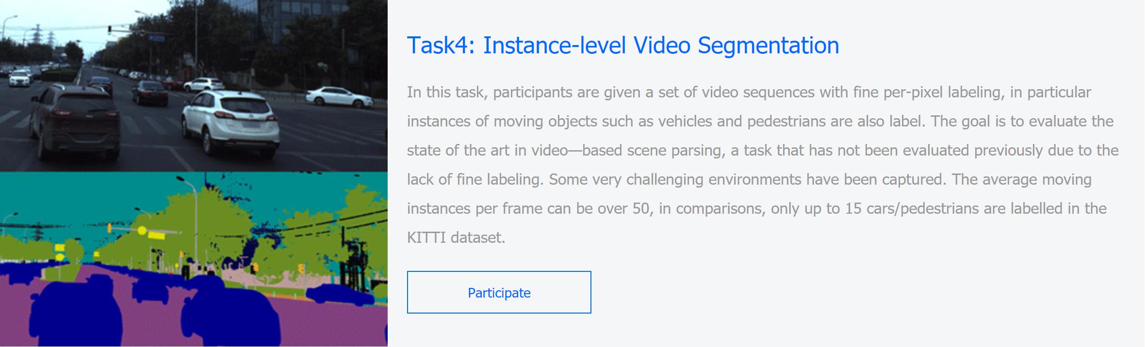 获奖名单显示,来自滴滴AI Labs的研究人员共参与了域适应语义分割(Domain Adaption of Semantic Segmentation)、可行驶区域分割(Drivable Area Segmentation)、实例视频分割(Instance-level Video Segmentation)三项竞赛。其中,域适应语义分割比赛要求参赛者利用迁移学习技术进行视频图像的语义分割,在带有标注的源数据上训练模型,并将其应用到目标域数据。该项任务的难点在于源域和目标域的地理位置、天气状况、时间等条件有显著差异。如,利用采集自美国加州的路况数据训练模型并成功应用于北京的路测数据是一项巨大的挑战。而可行驶区域分割要求参赛者能够在多种场景下识别出车辆所在的当前车道及同向可行驶的其他车道,尤其考验算法在车道线缺失、车辆遮挡、复杂路口等各种困难情况下的表现。实例视频分割要求参赛者将视频中每一帧进行像素级分割,识别出图像中每一个不同的实例物体,如行人、小汽车、自行车等,对算法的准确率和召回率都有很高的要求。