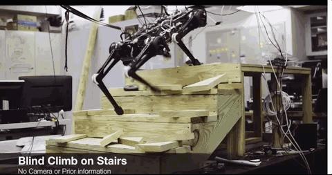 “我们想先做一个不需视觉的很好的控制器,”Kim说,“当我们为它增加视觉能力,即使可能反馈的是错误的信息,腿也应该能够处理(障碍)。因为如果它踩到了摄像机看不到的东西怎么办?它要怎样行动?这就是盲眼运动的作用。我们不想太过相信自己的视觉。”