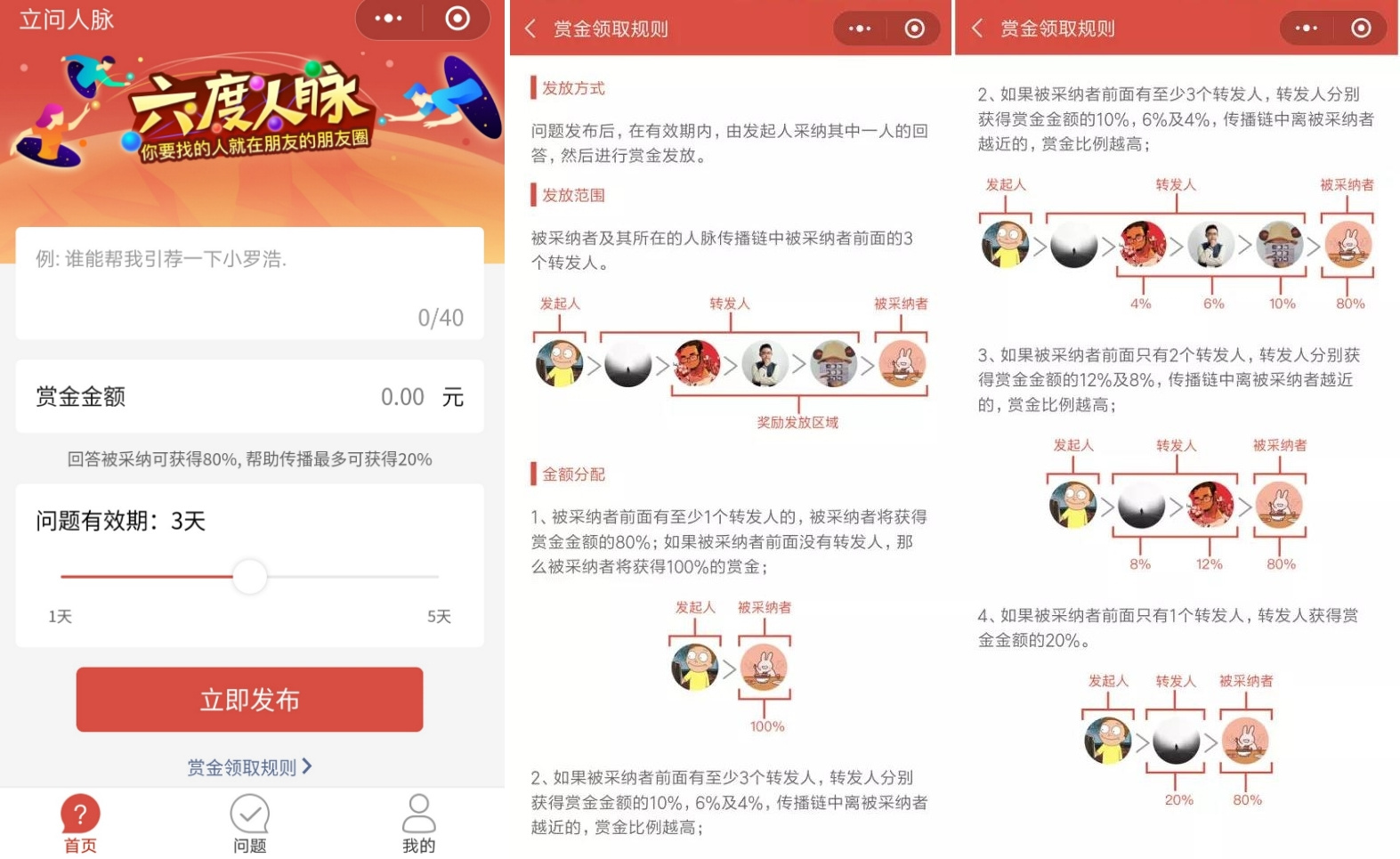 左一为寻人问题发布界面,左二及左三为『立问人脉』的赏金分布规则