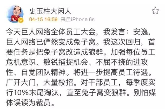 大概2年前吧,巨人网络的史玉柱前辈折腾了一出戏:向马爸爸取经,要搞狼性文化,恁死团队里的兔子。落地的政策也是很传统——末尾淘汰。