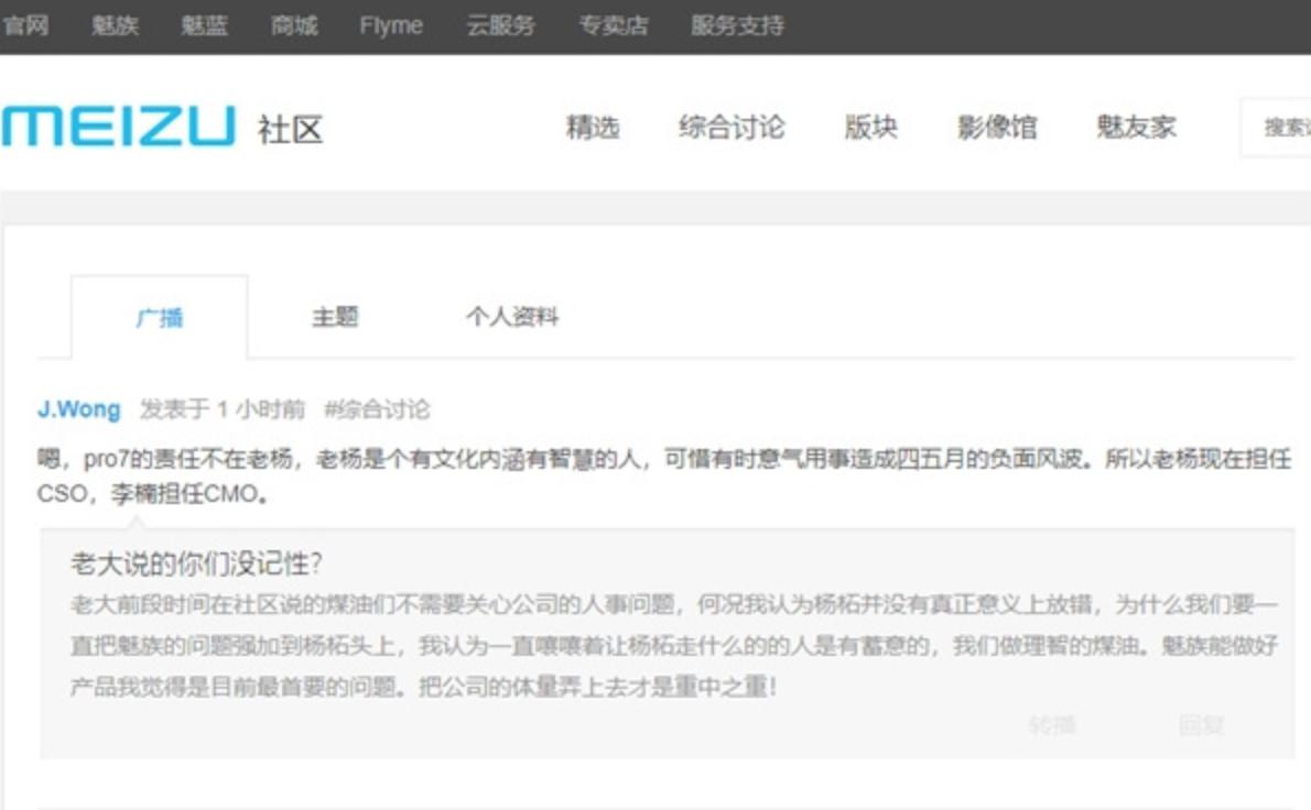 36氪讯,魅族创始人黄章在回复魅友的帖子中提到:“pro7的责任不在老杨,老杨是个有文化内涵有智慧的人,可惜有时意气用事造成四五月的负面风波。所以老杨现在担任CSO,李楠担任CMO”。